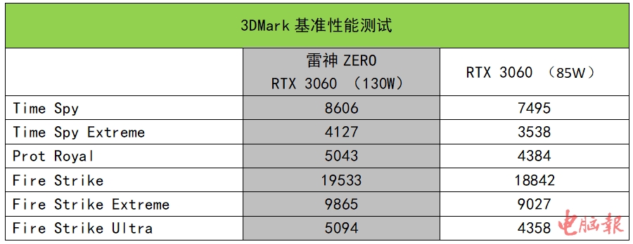 从3DMark的基准测试结果来看,雷神ZERO搭载的130W款RTX 3060分数不错,在Time Spy测试项目中显卡分数为8606,相比85W款有约15%的性能提升;而在Prot Royal光线追踪测试中,得分为5043,相比85W款性能提升幅度约为15%;在Fire Strike Extreme测试中,雷神ZERO得分为9865,相比85W则有9%左右的领先。
