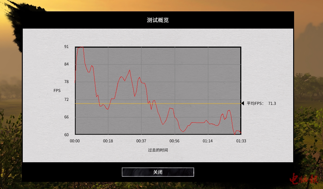 ▲《全面战争:三国》1920×1080外接显示器最高画质,雷神ZERO平均帧速71fps。