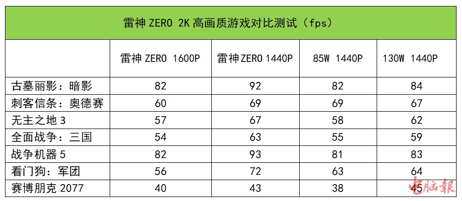 2K分辨率高画质下,我们可以看出三点。首先是2560×1440分辨率,从测试来看,雷神ZERO在绝大部分3A大作中都可保持60fps以上的平均帧速——至于优化烂的《赛博朋克2077》,建议在2K分辨率下开启DLSS,帧速会大幅度提升。同时,在同为外接显示器下,除了“众生平等奥德赛”外,相比85W款的RTX 3060则有不同程度的领先,比如《无主之地3》《全面战争:三国》《战争机器5》等游戏,领先幅度尤其明显。