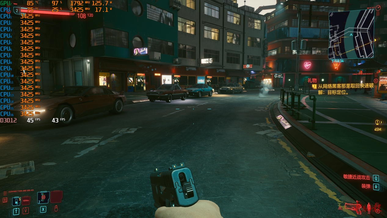 坦率地说,就考机而言,双核心的功率都挺高,频率也很亮眼,性能设定十分激进。但与此同时核心温度都不低,表现一般。实际上,双考时将处理器调教成45W/50W也没有什么问题,温度会好看许多。因为实际游戏中,8核16线程处理器不可能满载,比如在下面的《赛博朋克2077》中,处理器占用率仅25%左右,温度仅75℃。当然,对于追求满载功率的玩家而言,该机的核心功率非常猛。