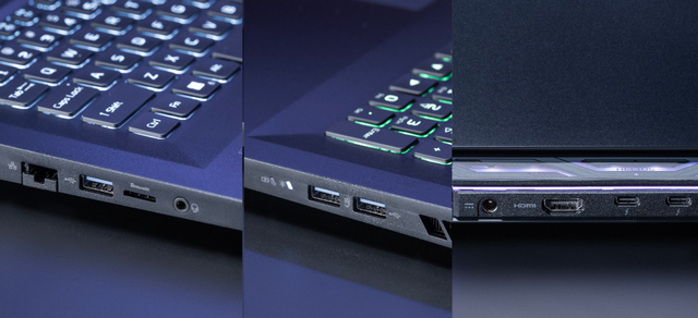 该机的接口数量多且规格高,左侧是USB-A大口和RJ45网口,右侧有两个USB-A 3.2 Gen2大口。尾部有两个雷电4,一个HDMI2.1扩展口和DC电源口。多达3个USB口分布在机身两侧,无论你咋用都没问题。双雷电4也给该机增加更多的扩展性,但挑剔地看,如果有一个雷电4口在机身左右两侧,那么日常使用时会更顺手一些。