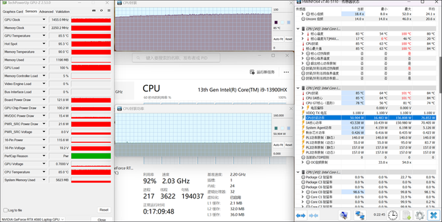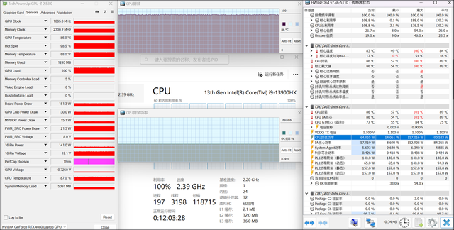 室温24℃左右,依然是极速模式,对掠夺者战斧18进行双考测试(稍微垫高机身),半小时之后的情况如下所示:i9 13900HX处理器的封装功耗约为65W,温度约86℃;RTX 4080的功耗在大概是150W,温度约87℃,整机满载的性能释放达到了215W左右,这个功率输出是相当猛的!
