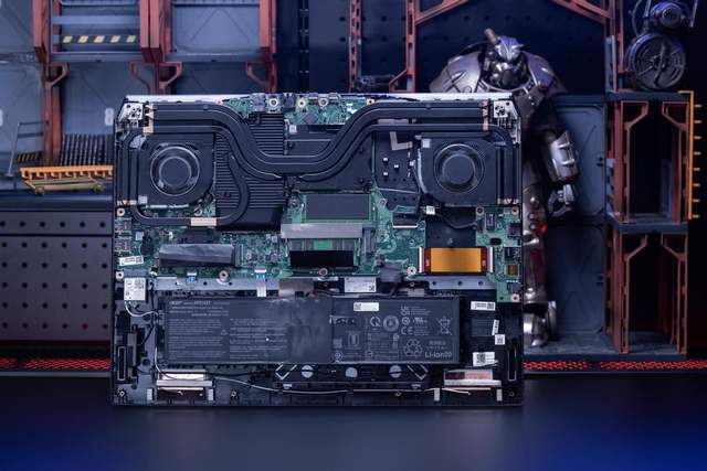 ▲内部散热设计,双第五代3D刀锋金属风扇搭配矩形矢量热管,相比上一代风扇通风量提升10%,加上液金散热和大面积的均热板,这让掠夺者战斧18在考机时可维持高功耗输出,并且将风扇噪声控制在了一个“不算起飞”的水平。