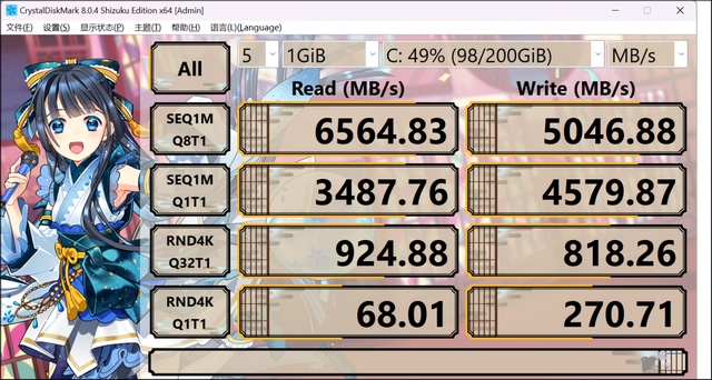 作为顶级游戏本,SSD素质是不用担心的,基本跑分连续读取速度为6564MB/s,连续写入速度5046MB/s。200GB大文件复制,尾速也在950MB/s以上,全程不掉速。