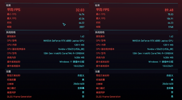 测试来看,开启支持“帧生成”技术的DLSS 3之后,游戏帧率的提升的确非常明显,已经足以对硬件要求极为苛刻的3A游戏在2K最高画质开启光追效果流畅运行了,例如《赛博朋克2077》的帧速从32fps飙升到了89fps,从卡顿提升到了流畅运行。