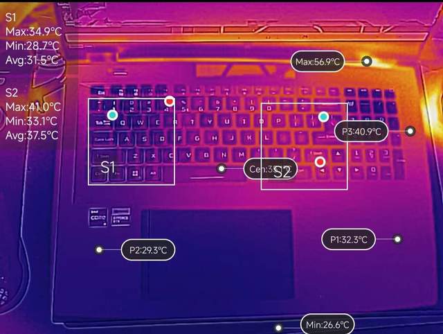 噪声和C面温度:实测双考满载时用户位噪声大概是57分贝,风扇噪声明显但不算起飞级别,纵向来看,在同配置游戏本中属于还不错的一款。C面温度方面,该机满载时键盘面也相当凉爽,手掌覆盖上去,几乎感受不到明显的热量堆积,也就右侧回车键区域稍有一些热感,隔热表现处于游戏本中的较好水平,玩游戏时基本不用担心C面温度高的问题。