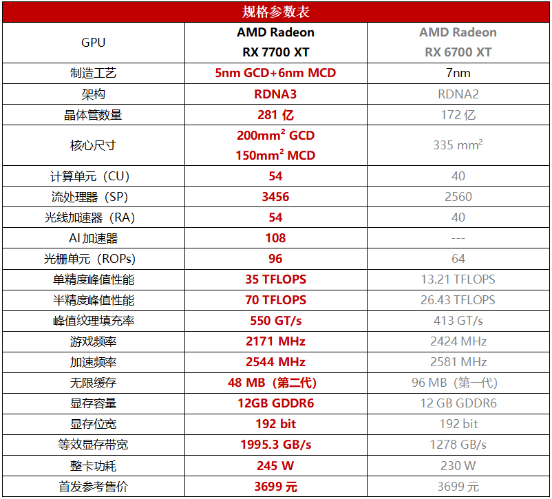 Radeon RX 7700 XT的基于Navi 32核心,采用了RDNA3架构和GCD+MCD的Chiplet设计。相较于上代Radeon RX 6700 XT,Radeon RX 7700 XT的规格提升相当明显。得益于5nm GCD+6nm MCD的设计,在总核心面积仅仅增加15mm2的情况下,晶体管数量增加了109亿个,达到了281亿个,晶体管数量的提升非常明显。