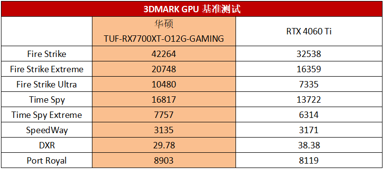 首先是基准性能测试。DX11部分,在FHD分辨率的FireStrike项目中,华硕TUF-RX7700XT-O12G-GAMING相较于RTX 4060 Ti的性能提升幅度达到了30%,这算是比较大的差距了。将分辨率提升到2K和4K的FireStrike Extreme与FireStrike Ultra项目中,华硕TUF-RX7700XT-O12G-GAMING领先的幅度大约在27%和43%,优势依旧稳固。