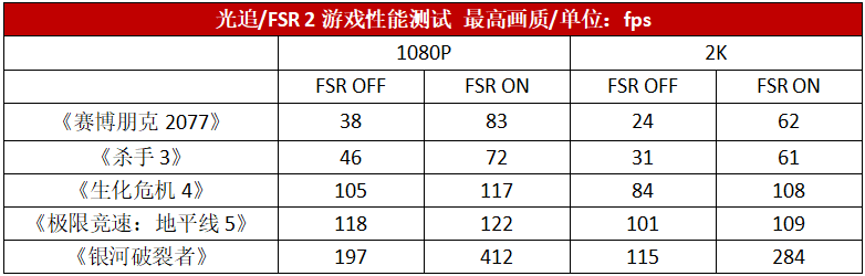 可以看到,开启FSR之后,游戏帧率暴增:在《赛博朋克2077》中,1080P和2K游戏帧速分别达到了83fps和62fps,《杀手3》的游戏帧速分别达到了72fps和61fps,实现了极致光追特效和流畅画面的兼得。我们还注意到,在《银河破裂者》中,开启FSR后,画面帧率直接翻倍,提升幅度分别在110%和147%。