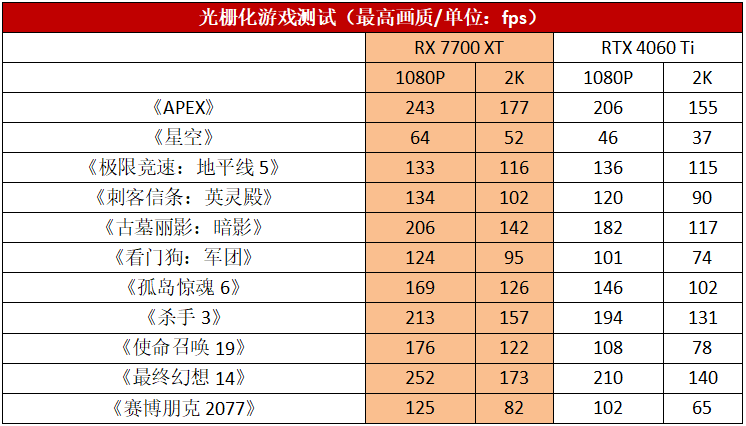 作为一款“以60+fps帧率畅玩1440P游戏大作”,华硕TUF-RX7700XT-O12G-GAMING在光栅化游戏中的表现完全符合其定位。而且与同为2K游戏定位的RTX 4060 Ti相比,其在游戏中的表现处于全面上风,领先的最大幅度达到了61%,优势非常的明显。