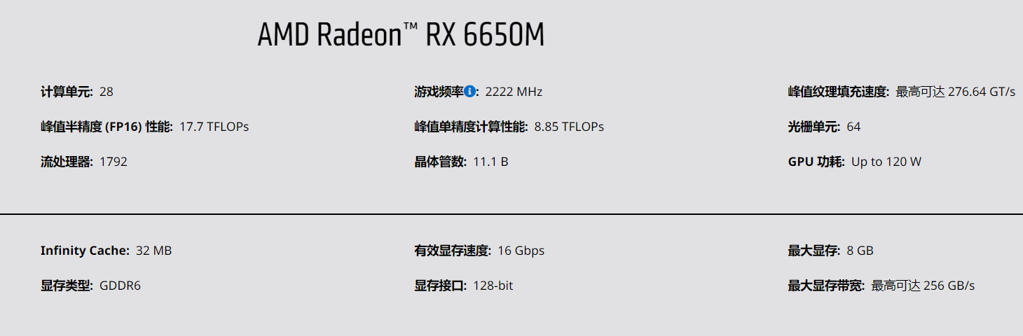 ■显卡:AMD Radeon RX 6650M 8GB 120W