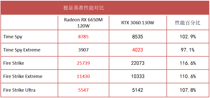 从基准测试来看,120W的RX 6650M 仅在Time Spy Extreme场景中跑分略输130W的RTX 3060一点点,而在其它项目中都胜出。RX 6650M Time Spy场景中的跑分是8785,稍微领先130W的RTX 3060,后者跑分是8535,而在AMD独显一贯具有优势的DX11测试场景中,RX 6650M相比RTX 3060,就有很明显的领先优势了,比如Fire Strike场景,为25739对22073,RX 6650M的性能领先幅度达到了16.6%!