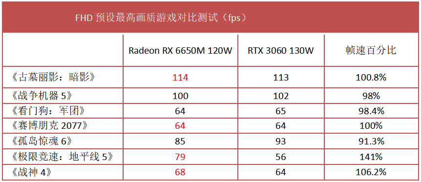 从游戏测试结果来看,可以总结出两点:第一点是锐龙7 6800H+RX 6650M的确是妥妥的FHD甜品级配置,就连优化最烂的《赛博朋克2077》在最高画质下也能跑到64fps的平均帧速,其他游戏更不是问题了,完全流畅运行;第二点是和130W的RTX 3060互有胜负,RX 6650M算是小幅胜出。但由于RX 6650M大显存优势明显,所以面对未来的3A大作会更加从容一些,基本不用担心FHD下爆显存的问题。