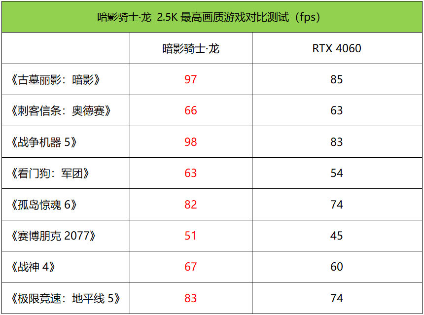 ●2.5K最高画质游戏性能测试中,暗影骑士·龙基本上都跑到了60fps以上的平均帧速,搞定2.5K最高画质3A游戏基本妥当。有的玩家会说,像《赛博朋克2077》这种平均帧速51fps的游戏流畅度咋样?51fps属于可以玩的水平。另外:近几年新出的热门3A大作基本都支持DLSS,比如《赛博朋克2077》开启DLSS 3质量之后,平均帧速会飙升到82fps,搞定2.5K,还是很稳妥的。