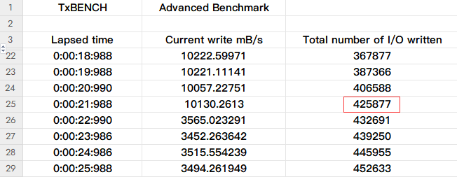 △全盘写入测试时,速度维持在10000MB/s一段时间后速度下降