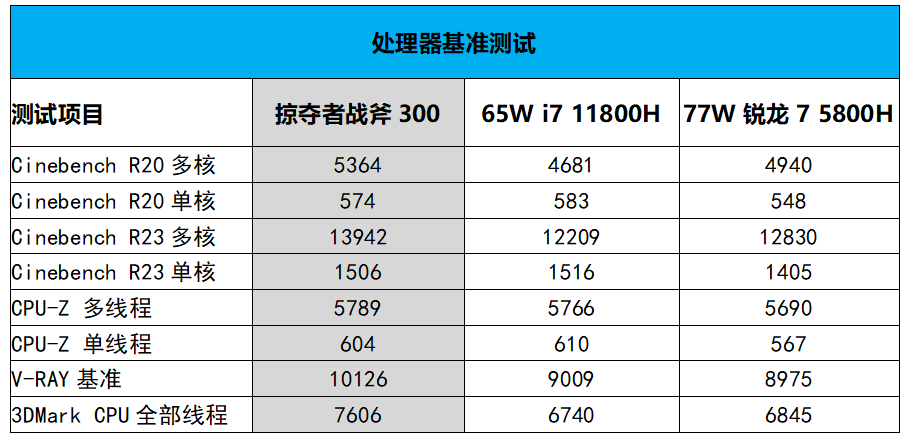 可以看到,在基准测试中,掠夺者战斧300搭载的这颗i7 11800H表现十分强悍!比如在大家最熟悉的Cinebench R20多核测试中,该机的多核分数达到了5364,相比65W款的i7 11800H提升幅度达到了14.5%,另外,目前只有少数机型在该项测试中可以突破5000,而这些机型基本都是狂暴猛机。同时在基准测试中,掠夺者战斧300的成绩也全部超越了77W的锐龙7 5800H。