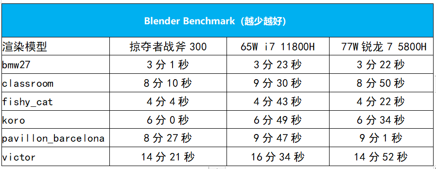毫无疑问,不管是从满载功率来看,还是从最终的渲染耗时来看,掠夺者战斧300的处理器性能释放都极为出色!尤其是在耗时较长的classroom和victor场景中优势最为突出。并且,该机的处理器性能不仅仅是在酷睿平台游戏本里遥遥领先,也胜出了高功率版本的锐龙7 5800H,堪称性能狂飙!