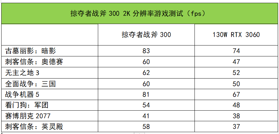 ▲《刺客信条:奥德赛》2K最高画质,掠夺者战斧300平均帧速为58fps,RTX 3060帧速较低,因为爆显存了