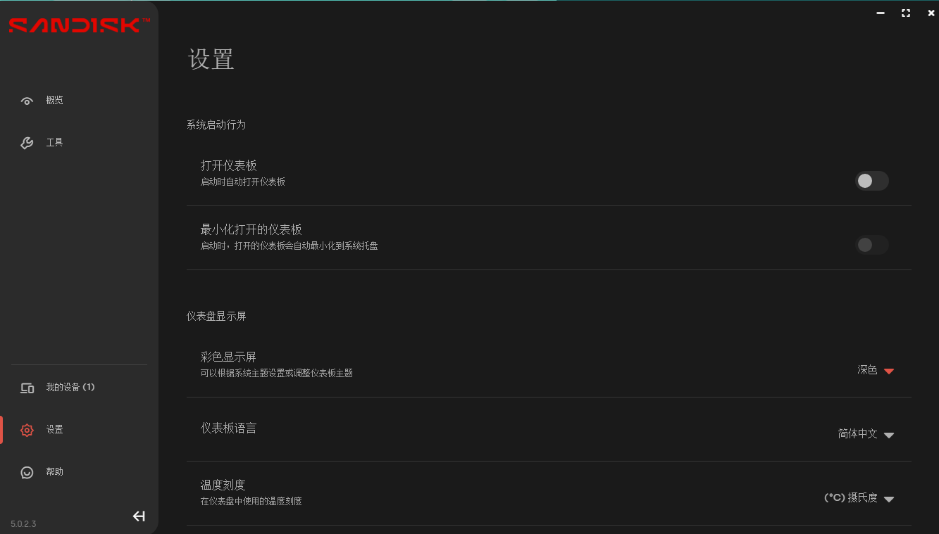 我们可以通过仪表盘工具更新固件,进行S.M.A.R.T诊断,擦除SSD以实现更高性能等等。用户还可以自己根据不同使用环境或者是个人喜好选择软件界面为深色还是浅色。