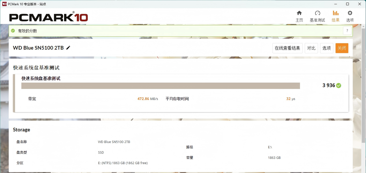 在PCMARK10完整系统盘测试中, 运行了系统启动、应用程序/游戏启动、复制多个大文件和许多小文件、Office和Adobe应用程序运作时的硬盘轨迹等。闪迪WD Blue SN5100 NVMe SSD得分3449,在快速系统盘基准测试中达到3936分,数据盘基准测试时为5846分,不算亮眼但也超出不少人对于QLC闪存的预期。