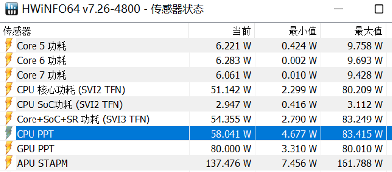 双考模式下,GPU一直保持80W输出,处理器最后保持在58W~60W的水平上
