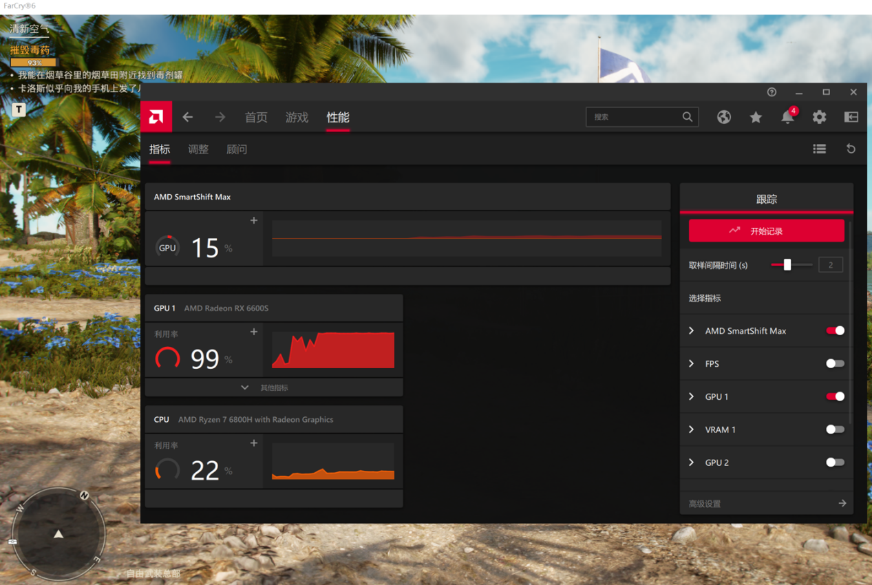 我们知道拯救者R9000X 2022是一款符合AMD Advantage(超威卓越平台)框架设计的3A平台电竞本,因此它当然也支持AMD SmartShift Max技术,可以灵活分配处理器与显卡的功率输出,实现最高的能效比和最佳噪声控制。我们在运行《孤岛惊魂6》的时候打开AMD Radeon Software观察,可以看到,在运行《孤岛惊魂6》这类偏重显卡性能的3A游戏时,AMD SmartShift Max的功率分配更倾向于显卡,整体功率分配偏向显卡15%,从而提供更高的游戏帧率和能效比。