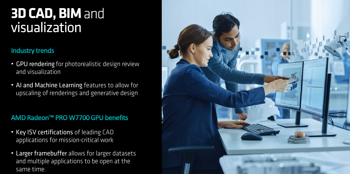 从规格和定位来看,AMD Radeon PRO W7700是一款专为主流工作流设计的工作站图形显卡。其配备的16GB ECC显存,可以帮助用户更好的深入复杂的CAD和BIM工作流程,能很好的保证渲染速度与精度,让多任务处理更加流畅。在这个基础上,用户可以更好的优化创作周期,优化任务模式并提高生产力,并更轻松的管理数据密集型任务。