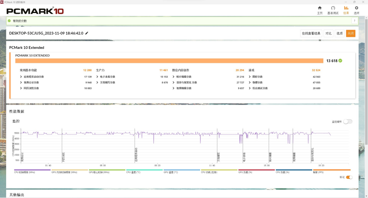 PCMARK10可以全方位的评估PC在日常使用时的实际应用性能。可以看到在PCMARK10 EXTENDED的测试中,搭载AMD Radeon PRO W7700的这套配置拿到了13618的总分,达到了目前主流中端机型的水平,能够很好的处理主流应用。