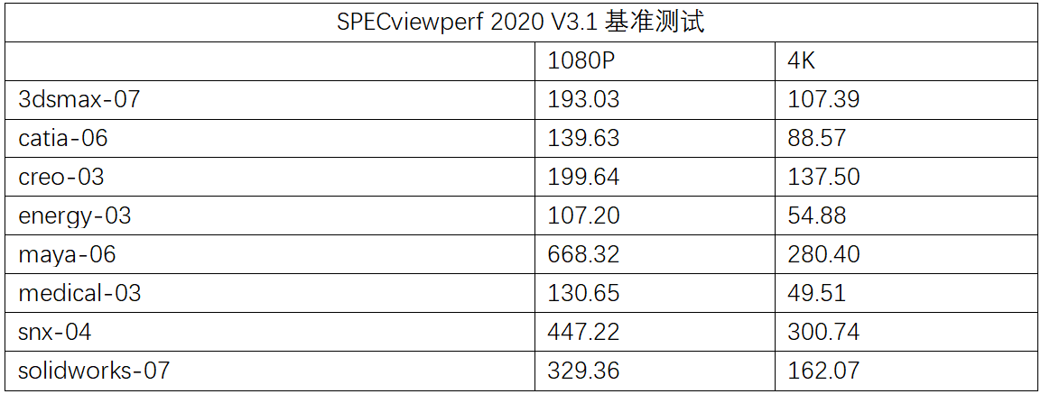 SPECviewperf是图形工作站领域权威和流行的综合benchmark软件,其测试符合专业级与工业标准,也是业界认可的效能测试软件。SPECviewperf 2020的8项测试中,catia-06、creo-03、energy-03、maya-06、medical-03、snx-04和solidworks-07均使用OpenGL 4.5图形驱动接口。而3dsMax-07则使用D3D图形接口。