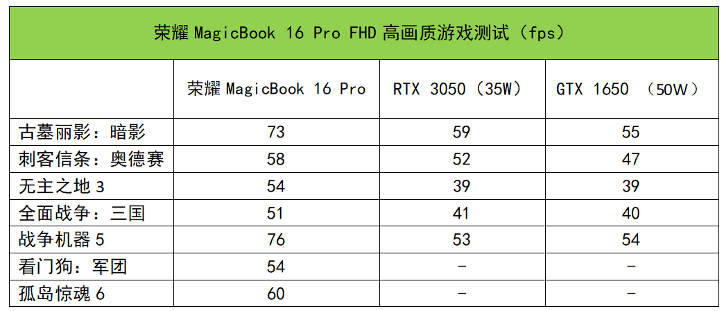 在FHD游戏对比实测中,首先能够看出:荣耀MagicBook 16 Pro足以在FHD高画质下流畅运行3A大作,从测试的几款游戏来看,均能维持50fps以上的平均帧速,流畅度无问题。