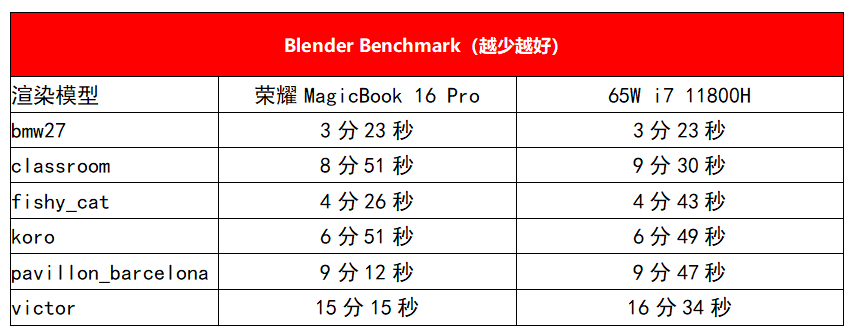那么,在较长时间的处理器满载中,荣耀MagicBook 16 Pro具体情况又怎么样?下面牛叔依然加入了65W的款i7 11800H一起来参加PK,测试项目选择的是Blender六个场景连续渲染,测试结果如下所示。