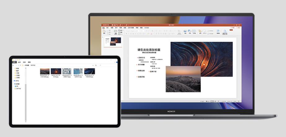 连接方式也非常简单,以手机/电脑互联为例,打开笔记本内置的电脑管家,即可一碰即连。文档素材拖动就能传输,极为方便。当然了,在笔记本上也可打开手机窗口,最多支持一主二副三窗口,轻松利用笔记本语音、视频通话。