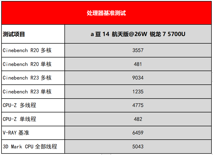 处理器性能测试是笔记本测评的传统项目,a豆14 航天版搭载的锐龙7 5700U处理器,具备8核16线程规格,基准频率1.8GHz,最高加速频率4.3GHz。其实如果你经常看测试文章就知道,对于锐龙7 5700U来说,处理器基准测试项目完全是“小菜一碟”——因为锐龙7 5700U的多核性能太强大了,在移动平台里轻松傲视友商!而且还有一个重要前提,它对功耗要求不高,尤其适合轻薄本搭载。