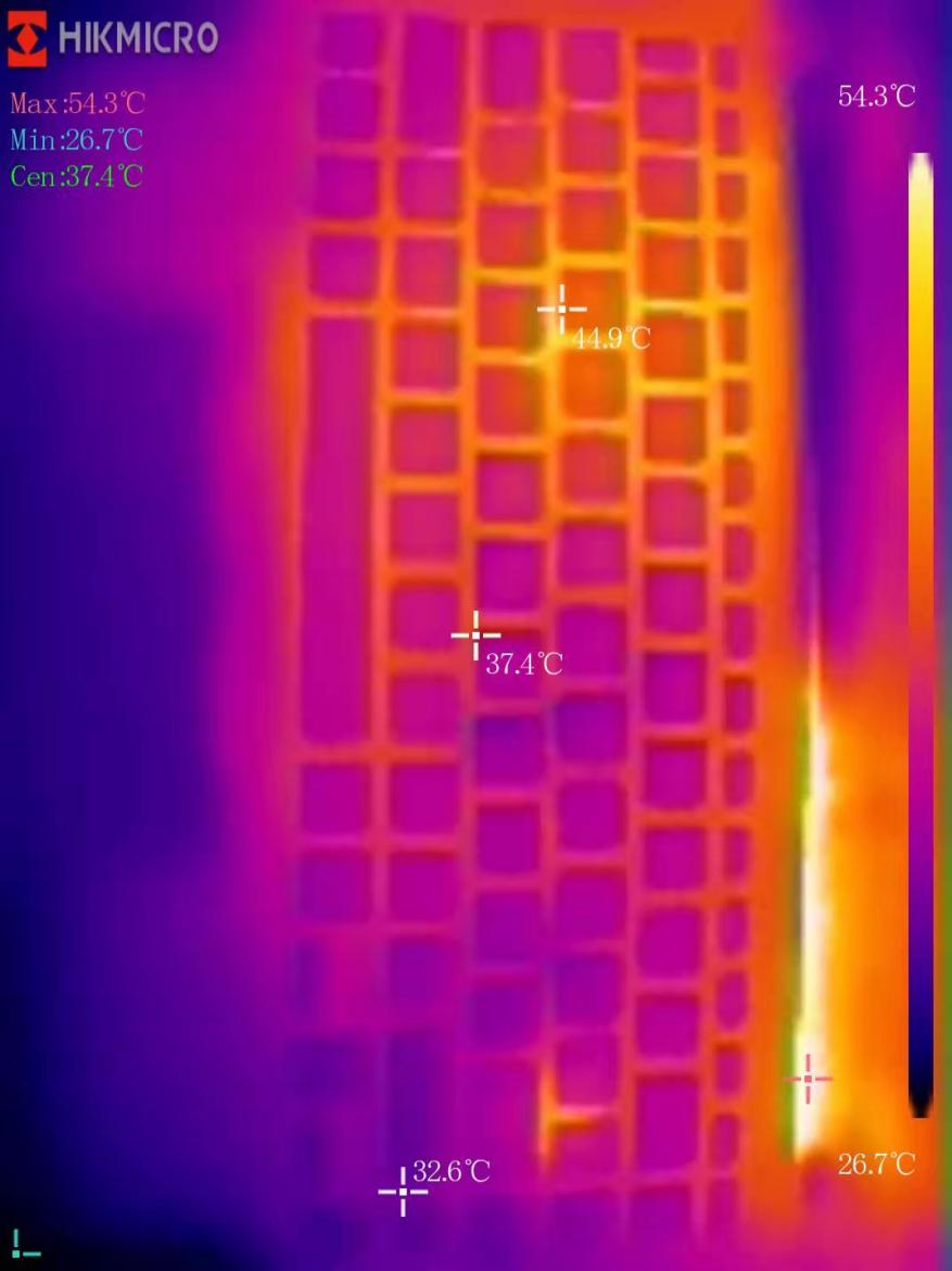 C面温度和噪声:处理器满载状态下,C面热量堆积在键盘左面区域,较热部分大概是45℃左右,有一些热感但是不烫,这是因为C面采用的是亲肤材质,从感受上而言要比金属材质机型凉快得多。风扇噪声方面,在高效模式下,键盘上方大概是47分贝,此时用户能听到一些风扇噪声,但说不上吵闹。