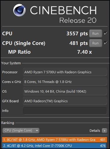下面从实测数据来分析,同时也方便大家从数据角度来了解26W的锐龙7 5700U性能表现。