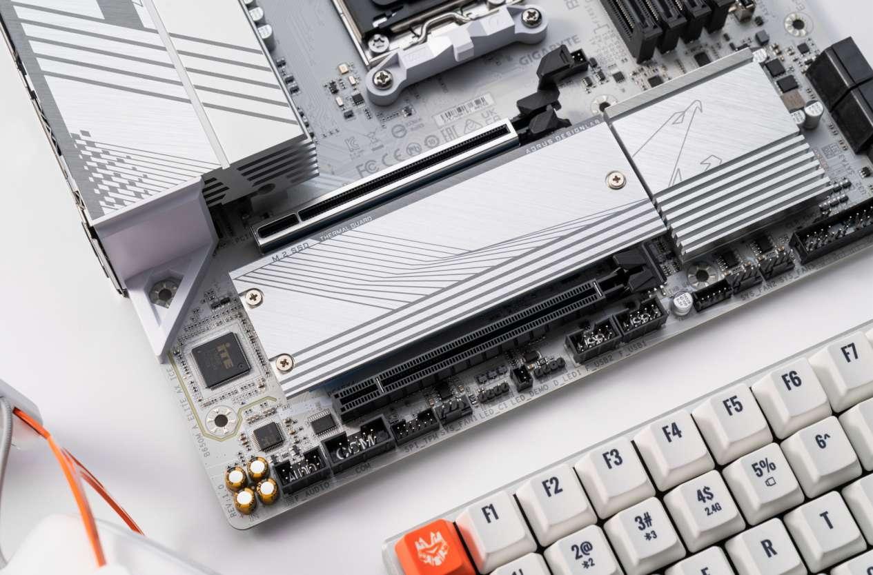 技嘉B650M冰雕提供了2条全长PCIe显卡插槽,其中主显卡插槽为PCIe 4.0×16规格,考虑到显卡对带宽的需求有限,这样的规格完全够用。同时在该显卡插槽上加入了超耐久用料,强力剪切试验提升了1.7倍,保持力测试表现提升3.2倍,为显卡提供更好的保护。同时主板还提供了1个PCIe 5.0 M.2插槽和1个PCIe 4.0 M.2插槽,对高性能SSD也有很好的支持。所有M.2 SSD插槽都配有EZ-Latch快易拆设计和散热片,安装方便、运行稳定。