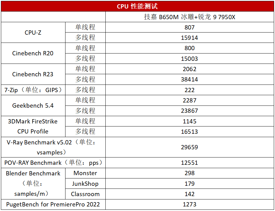 我们先来看看锐龙9 7950X在这款技嘉B650M冰雕主板上的表现,通过基准测试软件和专业应用软件对CPU进行了测试。无论是CPU的基准测试还是专业性能的测试,锐龙9 7950X的表现都不错,取得了不错的成绩,跑分与X670/X670E的表现相差不大,表明技嘉B650M冰雕完全有搭配高端CPU的能力。