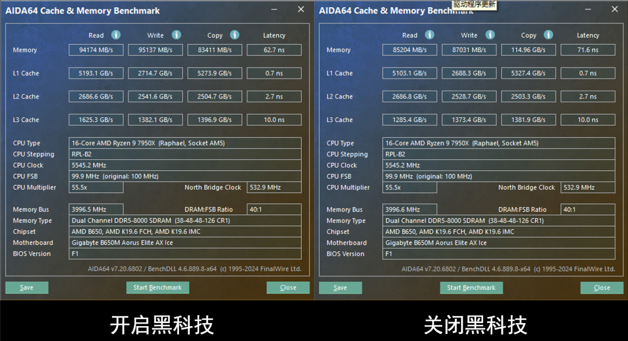 接着我们在BIOS中开启了高带宽和低延迟黑科技,在此设置下,内存性能再次得到了提升。读取速度从85204MB/s提升到了94174MB/s,增幅10.5%;写入速度从87031MB/s提升到95137MB/s,增幅9.3%;延迟也从71.6ns下降到了62.7ns,下降了12.4%。