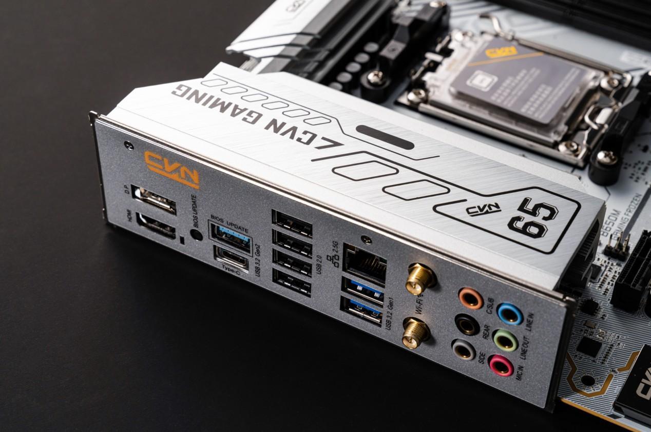 I/O接口部分,七彩虹CVN B650M战列舰为一体式I/O面板设计,在背面提供了4个USB2.0接口、2个USB3.2 Gen1接口、1个USB 3.2 Gen 2 接口以及1个USB-C(10Gbps)接口,USB接口数量多、种类也是比较的丰富。另外,该主板还支持一键升级BIOS的功能,加大地简化了升级BIOS的操作。