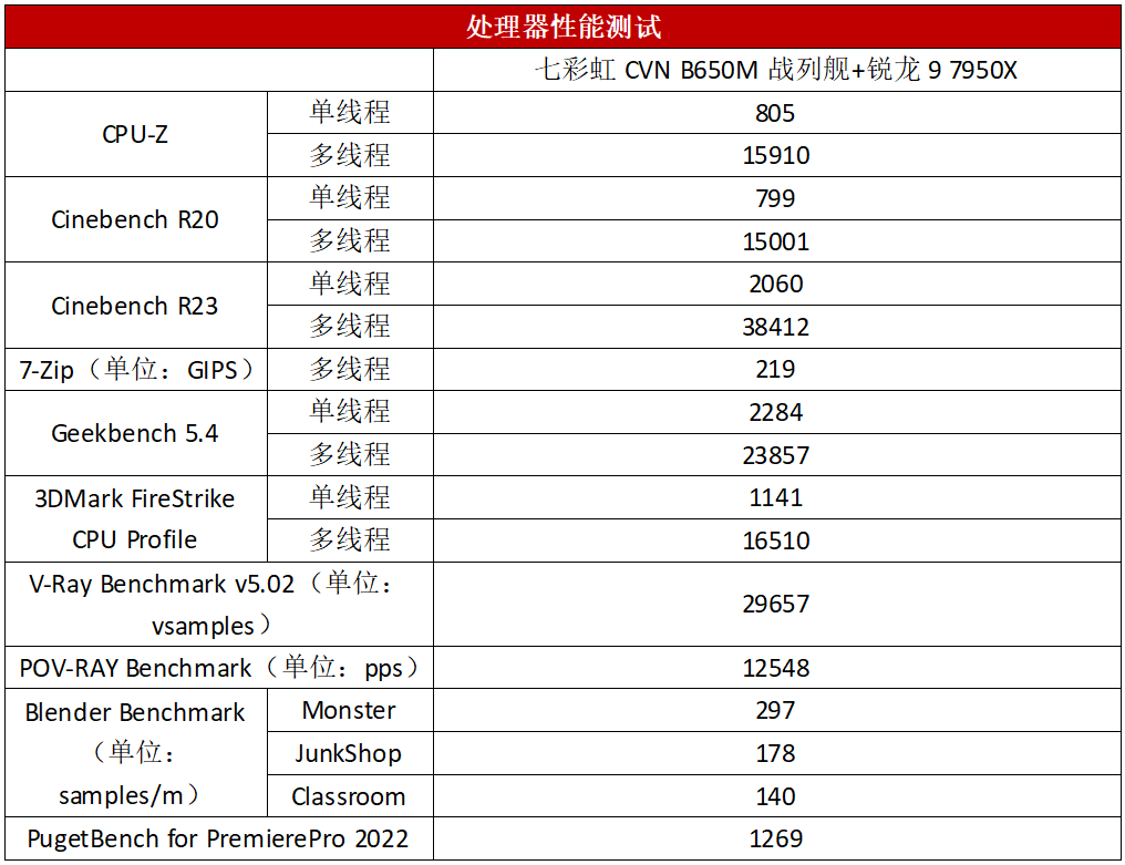 我们通过基准测试软件和专业应用软件对安装在七彩虹CVN B650M战列舰主板上的锐龙9 7950X进行了性能测试。考虑到七彩虹CVN B650M战列舰拥有12+2+1相强化供电设计,所以支持最高功耗只有200W左右的锐龙9 7950X来说,简直就是小菜一碟。在每一个项目当中,锐龙9 7950X都获得了相当不错的成绩。与X670/X670E的表现相差不大,表明七彩虹CVN B650M战列舰充分释放出了Zen4锐龙全系的性能。