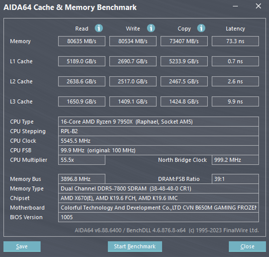 七彩虹CVN B650M战列舰对于高频内存的支持也值得大家的关注。在这里我们使用了两条影驰名人堂HOF EX DDR5 8000 24GB内存进行了测试,这里我们支持使用内存的XMP设置,直接将内存设置成7800MT/s,可以正常开机并通过测试。甚至超过了主板规格参数中支持的最高值,此时内存的读取、写入、拷贝速度都得到了提升,表现非常优秀。