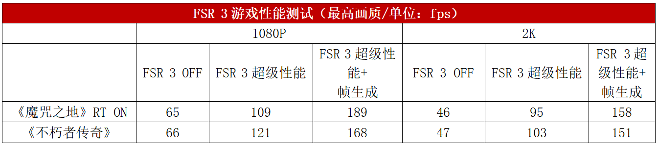 备受期待的AMD FSR 3技术终于在今年十月份的时候正式上线,FSR 3技术的核心与NVIDIA DLSS 3类似,都支持基于光流加速计算的帧生成功能。接下来,我们在支持FSR 3的《魔咒之地》和《不朽者传奇》两款游戏中进行了测试。在2K分辨率下,《魔咒之地》打开FSR 3超级性能模式后帧率从46fps提升到了95fps,打开帧生成之后帧率暴涨至158fps,相比原生分辨率提升了243%。《不朽者传奇》的FSR 3超级性能模式为103fps,打开帧生成之后的帧率达到了158fps,相比原生分辨率提升了221%。在1080P分辨率下,两款游戏的提升幅度稍微小一些,但都在150%以上,表现非常不错。