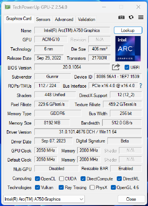 显卡:蓝戟英特尔锐炫A750亚运特别版
