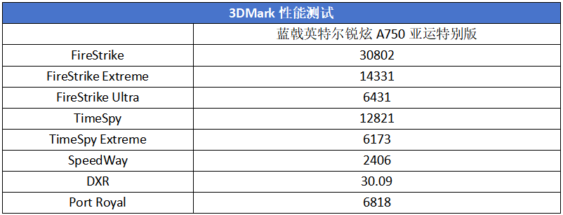 先来看看蓝戟英特尔锐炫A750亚运特别版在3DMark基准测试软件中的表现,得益于英特尔不断对锐炫显卡驱动的优化,相较于我们之前测试过的A750显卡成绩,该卡的各项成绩又有了进一步的提升。在接下来的游戏测试中,蓝戟英特尔锐炫A750亚运特别版的表现更让我们期待。