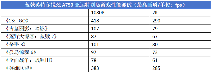 就算将分辨率提升到2K,蓝戟英特尔锐炫A750亚运特别版的表现依然游刃有余,测试的全部游戏平均帧率都在60fps以上,表明该显卡面对2K游戏也有一战之力。