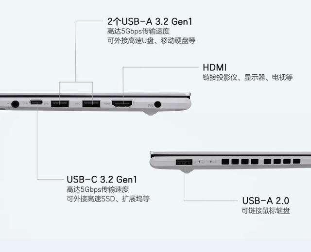 a豆14 Pro的接口也很丰富,左侧有一个USB 2.0接口,右侧有两个USB 3.2 Gen1 Type-A、一个USB Type-C 3.2 Gen1、一个HDMI以及3.5mm音频口,无须转接即能满足大部分情况下的扩展需求,只是没有高规格的雷电4接口,稍有一些遗憾。