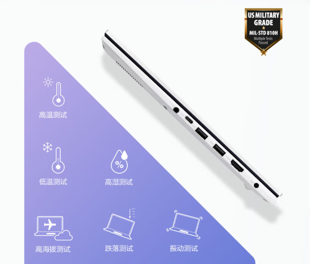 除此之外,a豆14 Pro在细节上也有很多升级,比如屏幕转轴支持180°开启,身体经常接触的键帽、掌托和触控板均加入了银离子抗菌涂层,抑菌率可以达到99%。摄像头加入了实体遮罩,担心个人隐私泄露再也不用在摄像头上粘贴纸画了,右滑物理挡板即可遮住镜头。而且作为一款时尚轻薄本,a豆14 Pro也并非徒有好看的外观,整机还通过了部分商用本才会进行的高低温、高湿、跌落和振动等军规级耐用性测试,整机在耐用度方面更有保证。