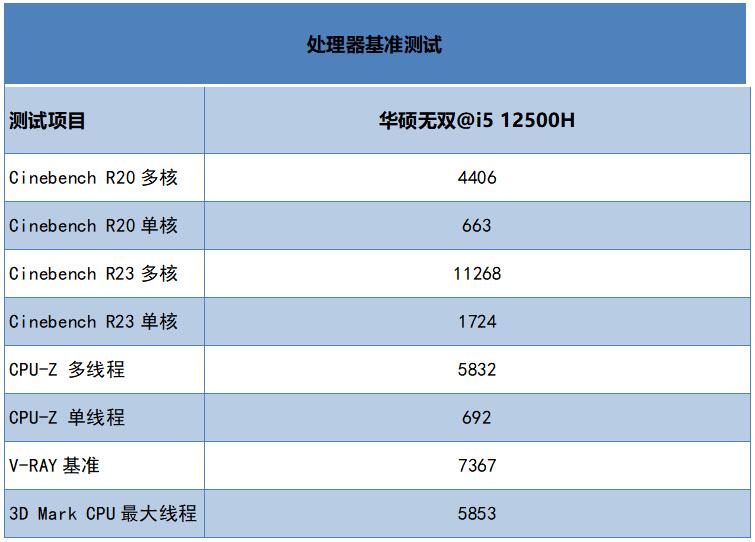 从数据测试来看,华硕无双搭载的i5 12500H基准测试数据很强劲。在大家熟悉的Cinebench 系列测试中,其R20多核测试成绩为4406pts,R23多核测试达到了11268pts——一般来说,要现在Cinebench R20达到4400pts以上的多核成绩,得8核16线程的标压处理器才行,但现在,i5 12500H就达到了!而如果是四核标压处理器,分数一般在2500pts左右,例如上一代的i7 11370H,结合这两个数据,可以看出i5 12500H的基准测试成绩的确强力。