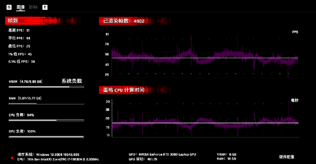 在FHD游戏对比实测中,暗影骑士·擎搭载95W款的RTX 3060相对90W款RTX 2060有较大幅度的领先。比较值得注意的地方是,上一代甜品独显RTX 2060在FHD下面跑50fps左右的游戏,RTX 3060可以跑到60fps左右,是个不错的提升。另外可以看到,95W款RTX 3060在FHD最高画质下跑《赛博朋克2077》平均帧速约50fps,可玩。