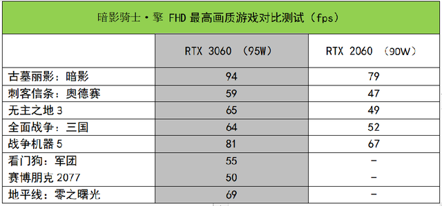 游戏实测,为了让大家了解暗影骑士·擎的详细实战性能表现,在FHD最高画质游戏测试中,牛叔同样加入了90W款RTX 2060作为对比对象。
